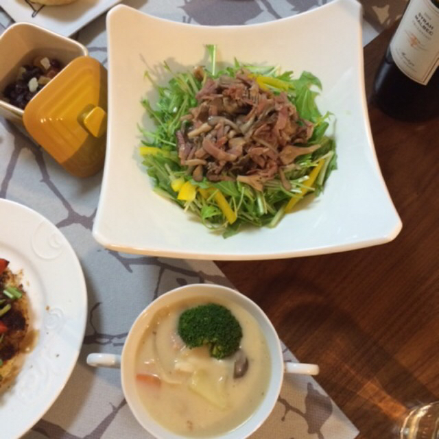 奥、水菜のサラダ。トッピングはまいたけとベーコン。手前、クリームシチュー。