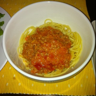 自家製ミートソーススパゲティ/にんじん、セロリ、玉ねぎ、ベーコンをみじん切り。意外と手間かかる。