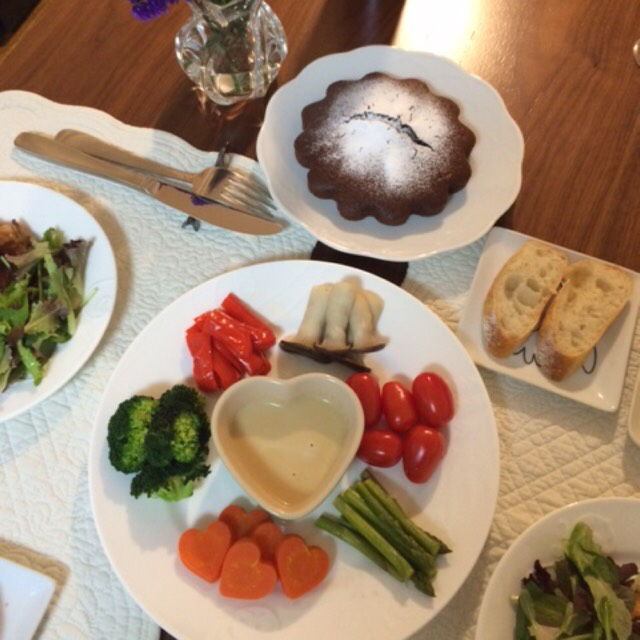上、ガトーショコラ。下、バーニャカウダとゆで野菜。