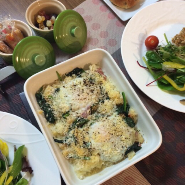 半熟卵とほうれん草ドリア。これもフライパンを使わずにこのオーブンプレート上でアレンジ。