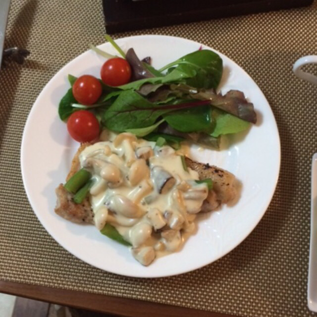 ポークソテーホワイトきのこソース。タイで食べて美味しかったので再現。