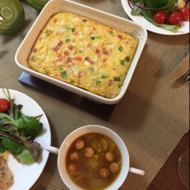 上、野菜オムレツ。下、カレー風味のキャベツスープ