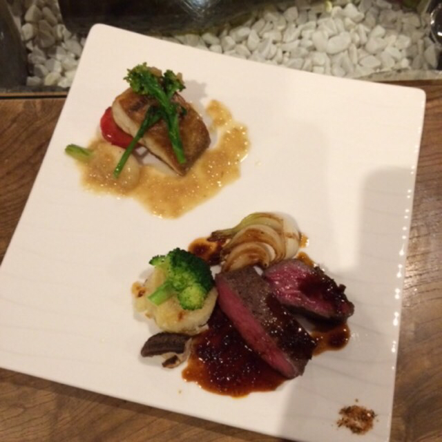 メイン、鰆のソテーソースブールブラン。京都和牛のロティエシャロットのソース。