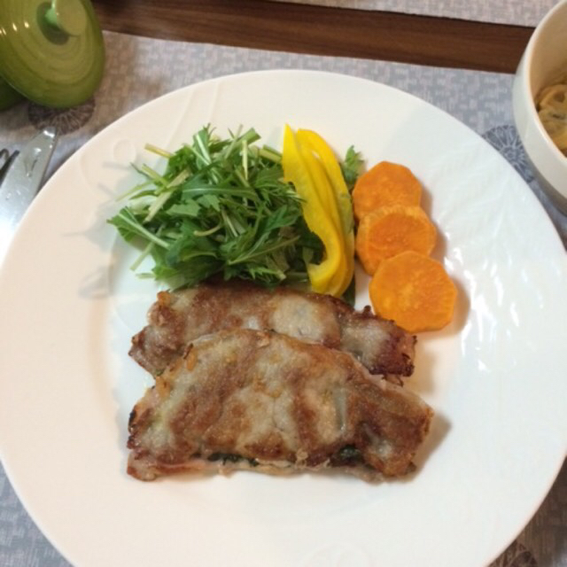 サルティンボッカ、豚肉に大葉と生ハムを挟んでます。我が家の定番メニューになりました。