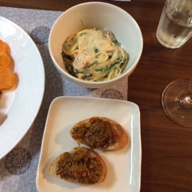 上、ほうれん草ベーコンクリームパスタ。下、キーマカレーパン、前日のキーマカレーが残っていたので。