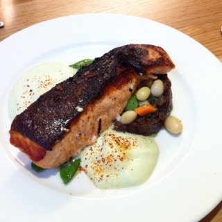 ローストサーモン。皮が香ばしく焼けていながらサーモンは脂がのっている。