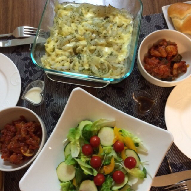 上、玉ねぎグラタン、新玉オンリーにチーズたっぷり。下、カラフルサラダ。