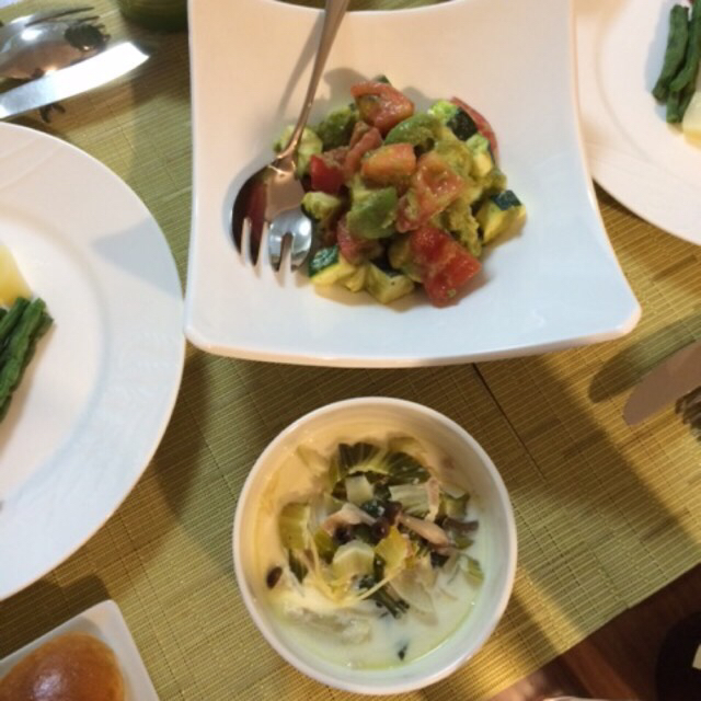 上、アボガドとトマトとズッキーニサラダ。下、チンゲン菜のクリームパスタ、前日のスープに粉チーズを足して濃くしてパスタソースにリメイク。