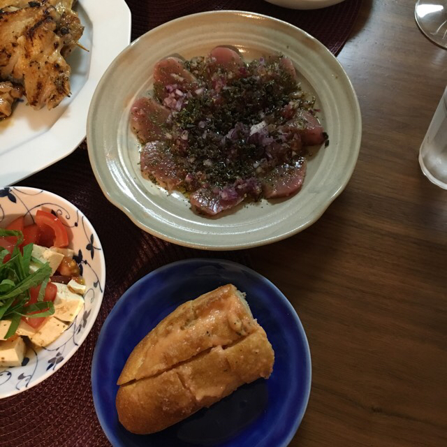 かつおの黒オリーブカルパッチョ。黒オリーブと赤玉ねぎ、イタリアンパセリを散らしてます!
