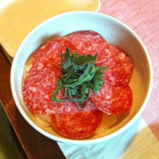 ビアサラミと大根のマリネ→大根を薄切りにして塩もみし、サラミとしそのせん切りをのせるだけ