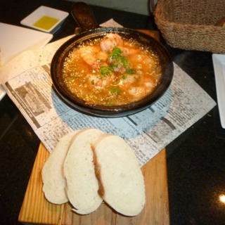 お店の定番中の定番メニュー「海老のアビージョ、生ハムと白ワインの香り」。カウンターの上にずらっと並べられていました。このスープをパンに浸して食べるのがとっても美味!