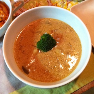 鶏ときのこの味噌クリームシチュー、なかなか美味☆、飾りにブロッコリーを浮かべてます