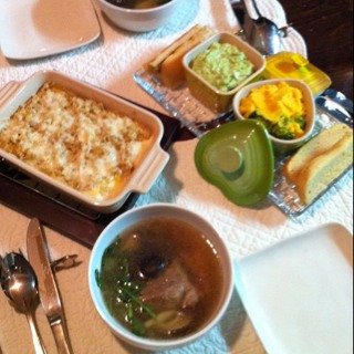 豚肉ときのこのスープ、昆布とかつおぶしでだしを取り、しょうがと粗塩で味付け。ピノには合ってたかな。