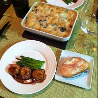 帆立にベーコンを巻いて爪楊枝を刺したまま焼く。同じフライパンで砂糖小1、赤ワイン大1強、酢大1、塩少々、バター大11/2を煮詰めカラメル状にしてソース作る。