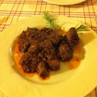 Ginghiale alla Cacciatora 猪肉のトマト煮込み、この地域の郷土料理とのこと、地元のしっかりワインと相性抜群、マリアージュを実感