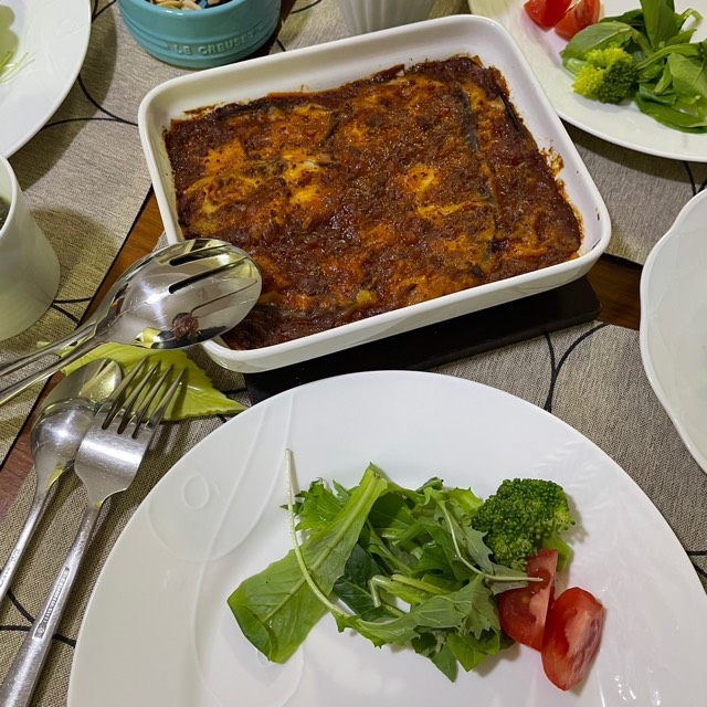 中央、餃子の皮のなすのラザニア、我が家の定番。