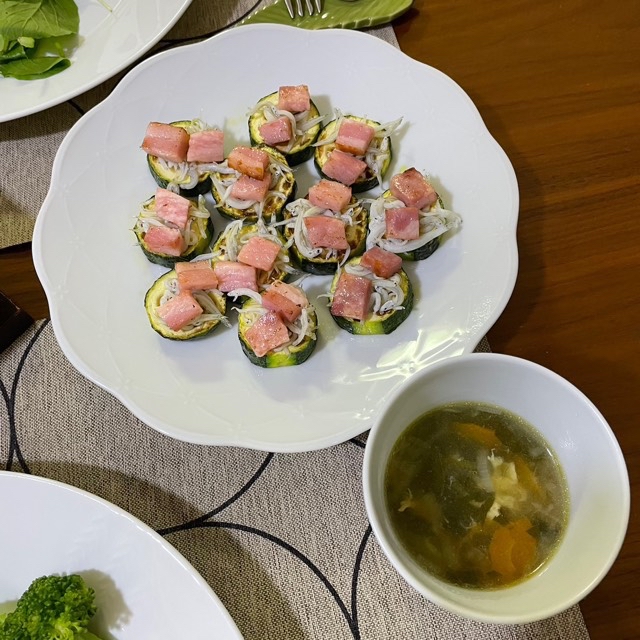 ズッキーニとしらすベーコンのオードブル。下、卵野菜スープ。