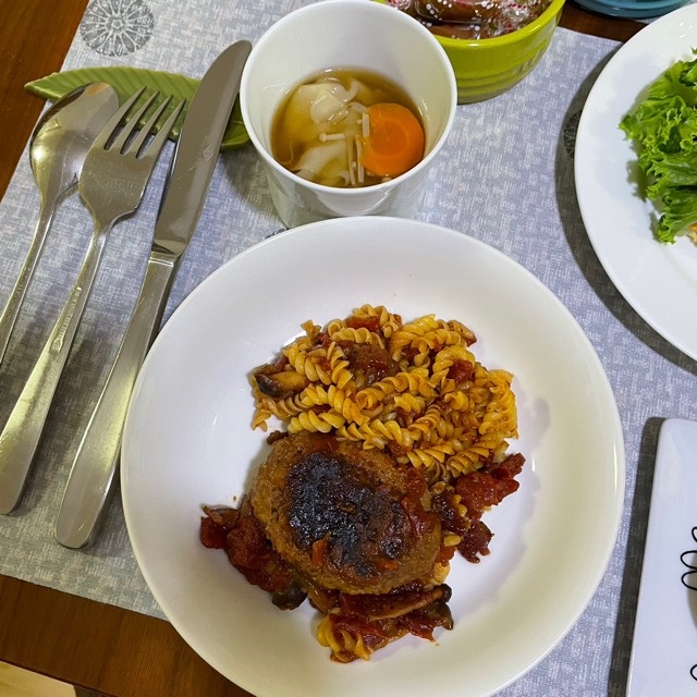 定番のトマト煮込みハンバーグ。娘が10歳で食べるようになりサイズアップ…