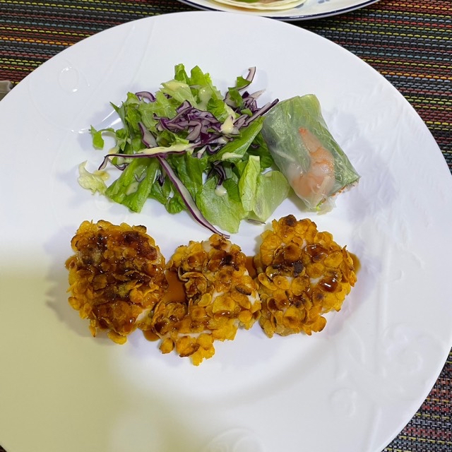 コーンフレークで作る!ザクザククリスピーチキン。コープのキットです。右上、生春巻き。
