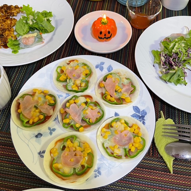 餃子の皮のピザ。かぼちゃとおばけの形のハムを載せたのだけど、分かりにくかった。