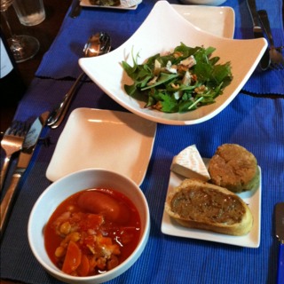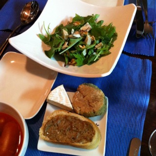 上、ブルーチーズサラダ。下、パン皿の右上は群馬の叔母が庭でとれたふきで作ったお焼き。