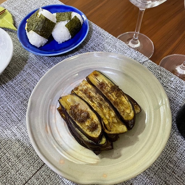 下、焼きなすのマリネ。上、娘のリクエストで梅おかかおにぎり、ツナマヨたくわんおにぎり。
