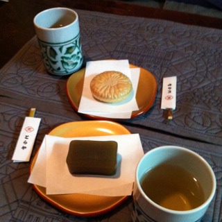 スイーツはとらやの最中、弥栄と羊羹、新緑!とらやさんでお願いしたら、懐紙と黒文字をつけていただけました。