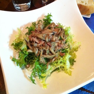 エンダイブのサラダ。トッピングにベーコンとまいたけをたっぷりめのオリーブオイルで炒めて、そのままドレッシング代わりに!