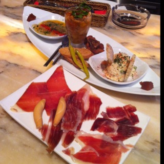手前、イベリコ豚2種とハモンセラーノの盛り合わせ。奥、タパス3品盛り。