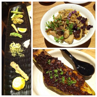 左、夏野菜の天ぷら。上、きのこソテー。下、茄子田楽。