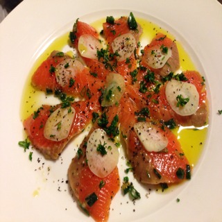 マグロをさっと炙りレモンソースで味付け。仕上げにオリーブオイルとニン....