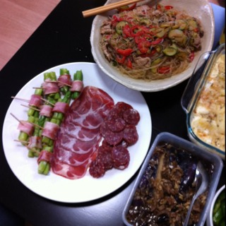 チャプチェ、生ハム、アスパラベーコン巻き、茄子の煮浸し