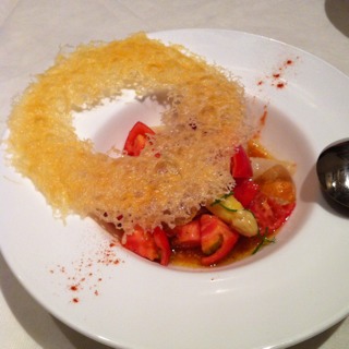 ホワイトアスパラガスとフルーツトマトのサラダ、白ワインゼリーとカリカ....
