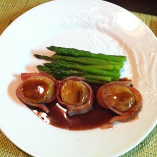 帆立にベーコンを巻いて爪楊枝を刺したまま焼く。同じフライパンで砂糖小....