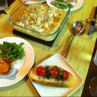 左手前はブルサンチーズとパン、ポテトサラダの生ハム巻き