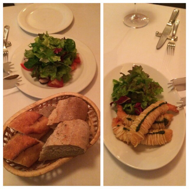 シーフードマリネサラダとバゲット。海老のカリカリじゃがいも包み。