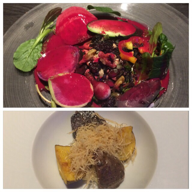 前菜、ビーツソースドレッシングのサラダ、海藻や豆類もたっぷり。温野菜....