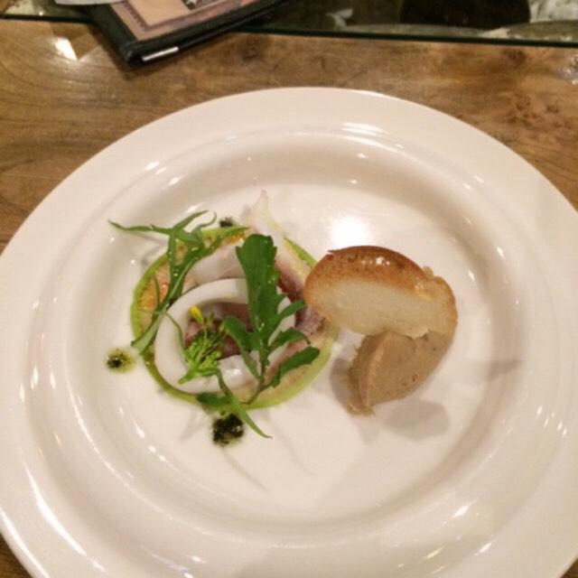 左、パン、中が空洞の大きなパン。右、アミューズ、野菜のムース海の幸コ....