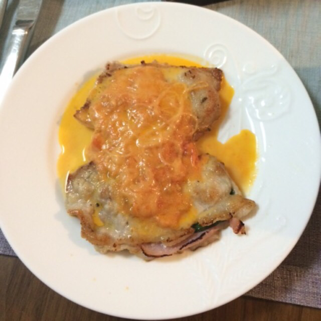 サルティンボッカトマトチーズソース。モッツァレラチーズとトマトのソー....