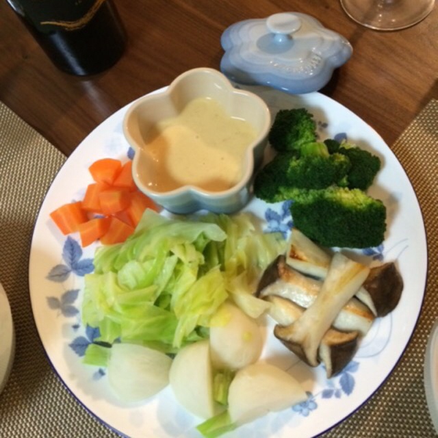 温野菜サラダ。マヨネーズと味噌ベースのソースで、バーニャカウダ風に。