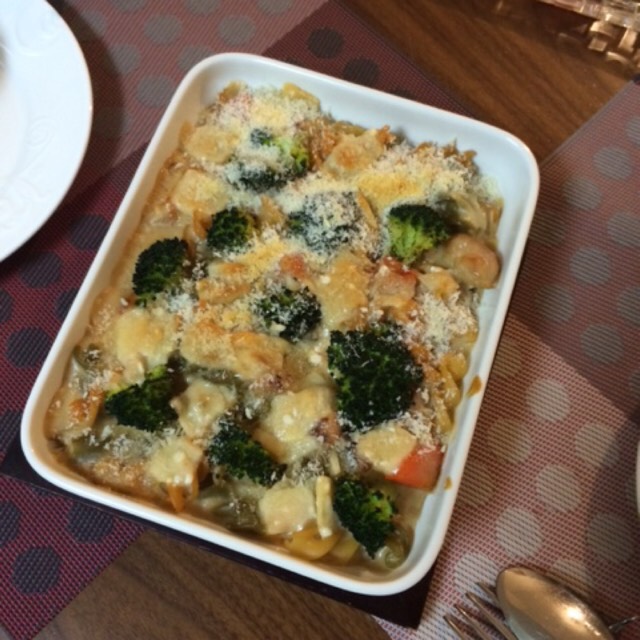 チキンクリームグラタン。ブロッコリーも色どりに。