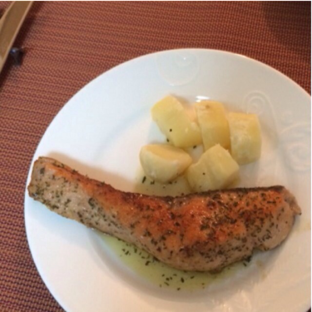 秋鮭のムニエルとメイクイーン。秋鮭、脂がのっていて美味しい。
