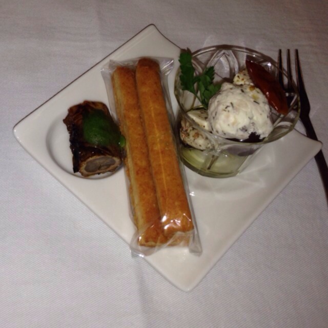 アミューズ。柚子風味のチーズバター。穴子八幡巻き。二種類のオリーブと....