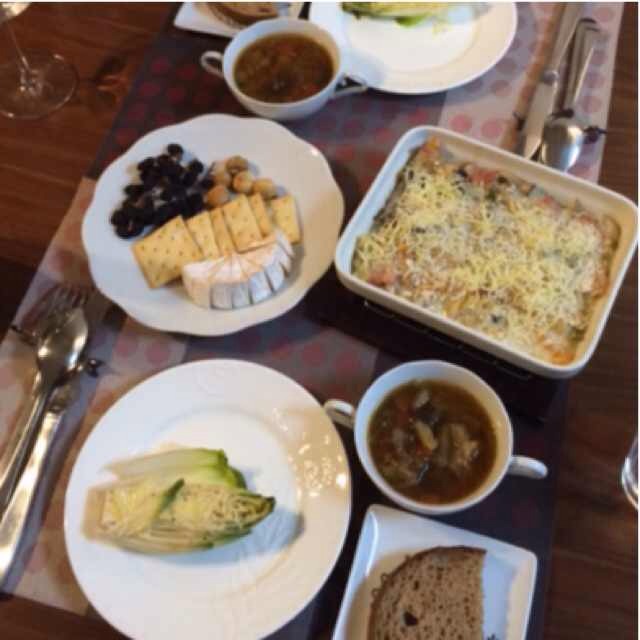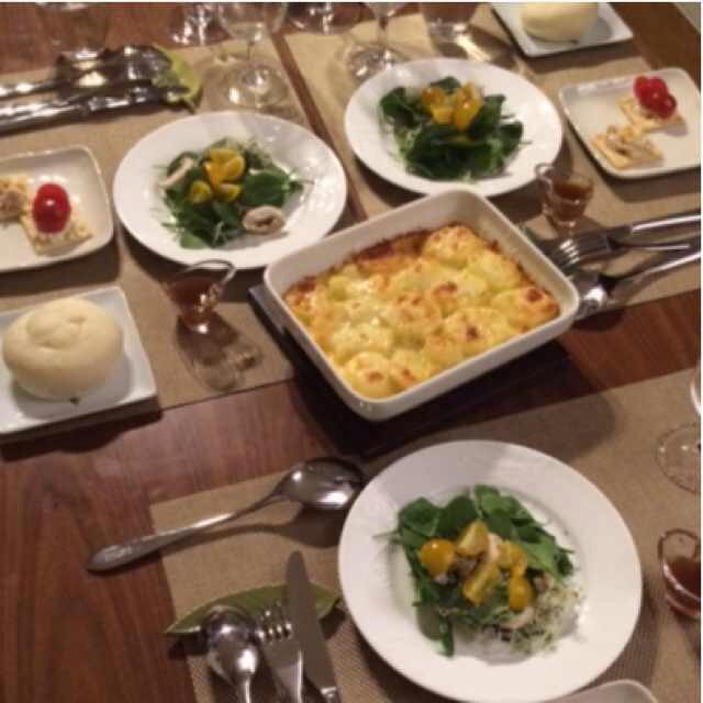 友人が食事にきて3人分。中央はメイクイーンのグリュイエールチーズ焼き。