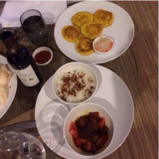 上Perkedel Jagungコーンのパテ。下Babi Kecap豚肉とご飯。