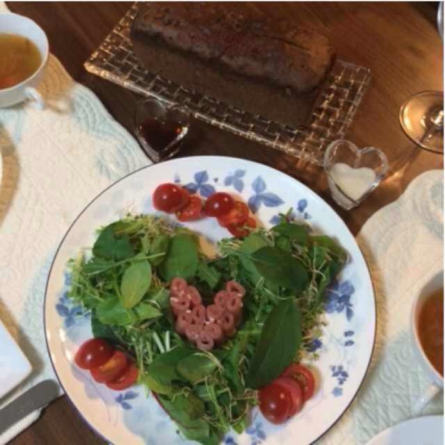 サラダを♡型にしてみました!真ん中は生ハムをクルクルしました。奥はチ....