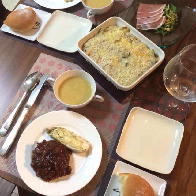 下、デミグラスハンバーグ煮込み、チコリ焼き。中、コーンポタージュスープ。